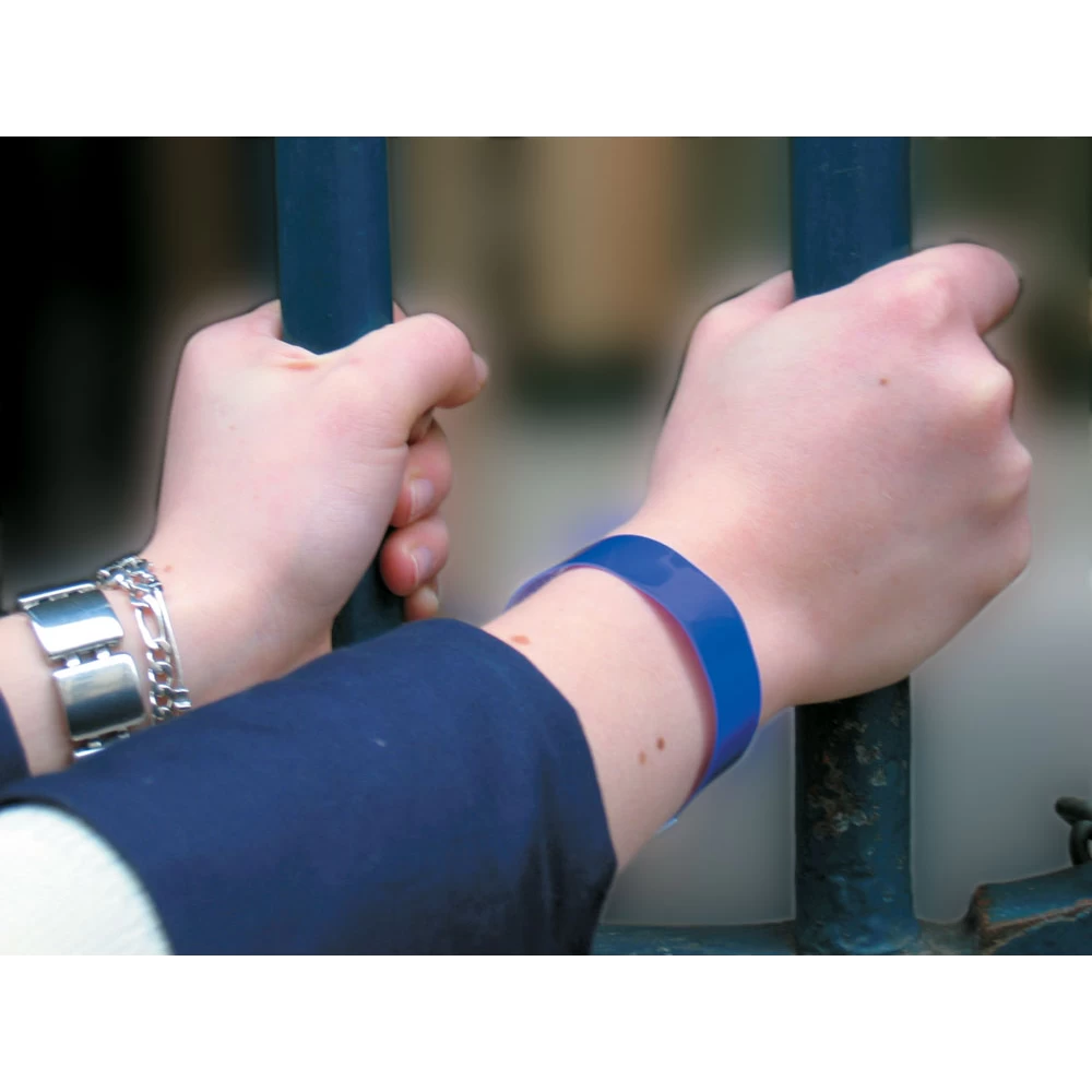 Son système d’attache intransférable vous assure une sécurité incontestable. Ce bracelet vinyle classique pailletés se fixe au poignet par un simple bouton-pression et il est ensuite impossible de le retirer sans le couper ou le casser.