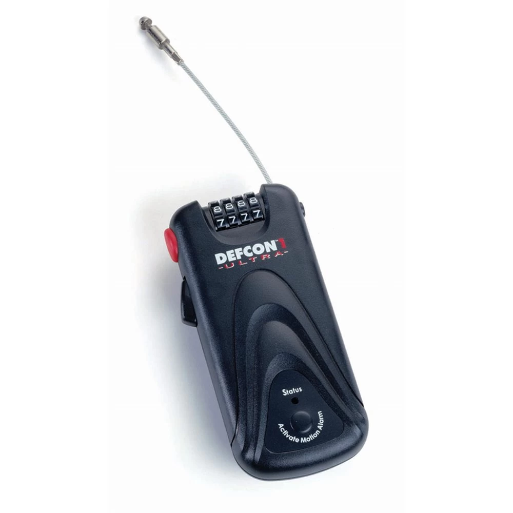 - Son câble antivol en acier inoxydable auto-rétractable de 0,90 m de longueur. En cas de tentative de vol, une alarme sonore de 105 dB se déclenche, libérant de fait un son strident.
