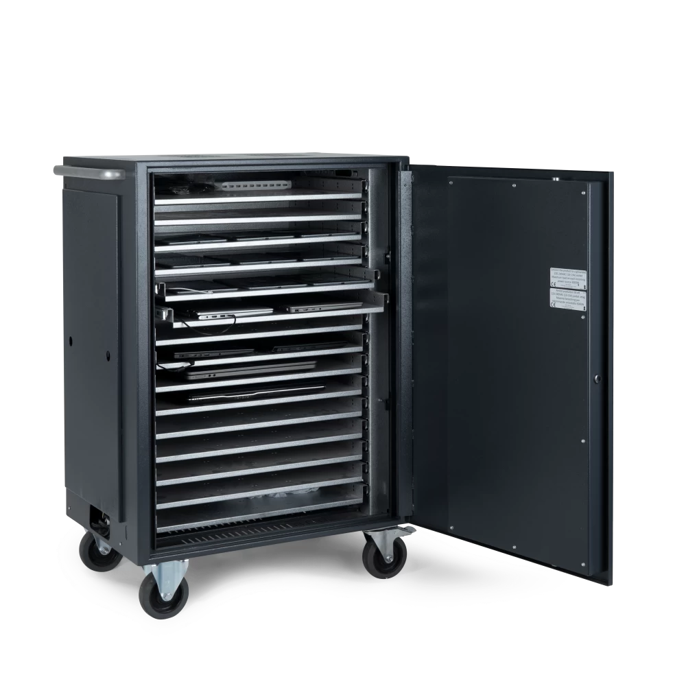 Le modèle Fort Knox Draw, doté de tiroirs multiples, permet une organisation efficace des portables ou tablettes. Chaque tiroir, conçu pour accueillir un ordinateur portable ou une tablette, est équipé d’un système de recharge intégré. Cela simplifie le processus de recharge, réduisant le besoin de multiples prises et rallonges électriques.