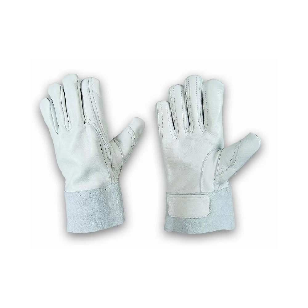 Gant en cuir pleine fleur de bovin entièrement renforcé sur la paume, le pouce et les doigts (épaisseur 1,1-1,2 mm) Ce gant comporte une manchette en croûte de 8 cm (épaisseur 1,1 – 1,2 mm) et un renfort en cuir pleine fleur pour protection des veines Cousu avec fil de KEVLAR .
