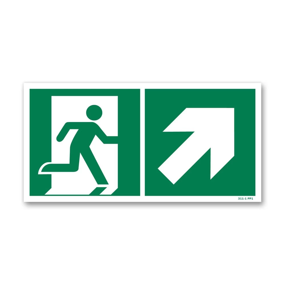 Ce panneau indique la présence d’une sortie de secours par un escalier qui monte à droite