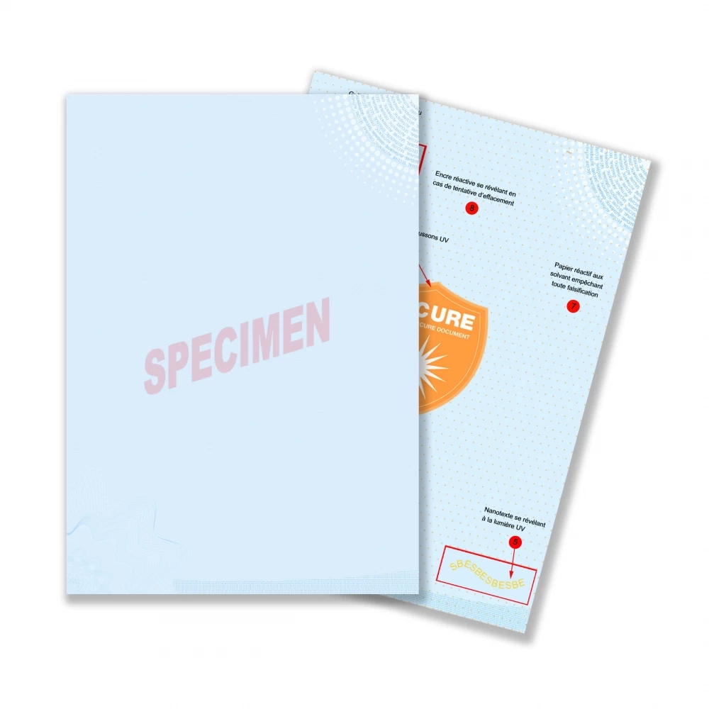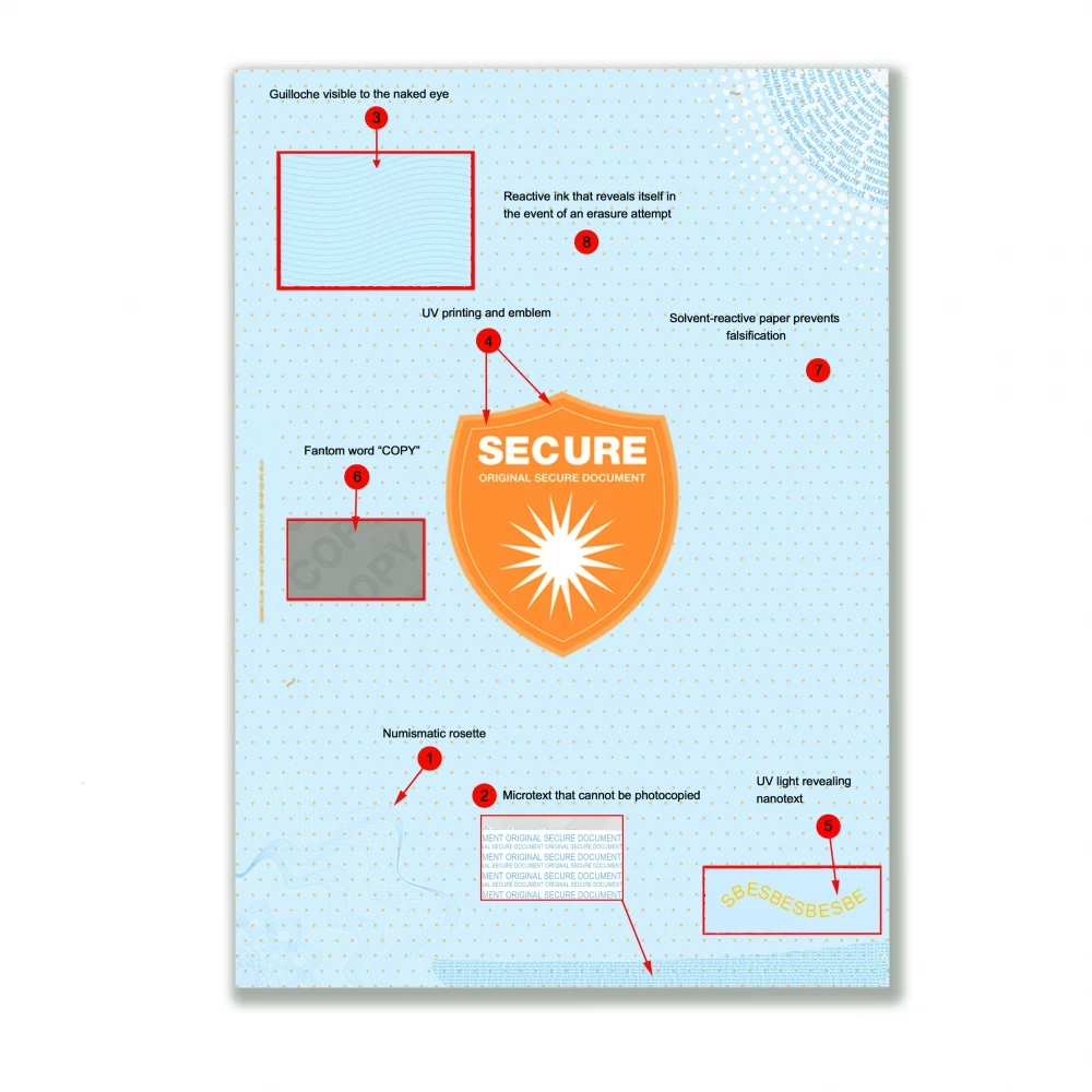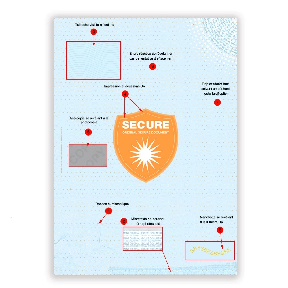 Le degré de sécurité de votre document diffère évidemment en fonction du nombre de points de contrôle présent sur le papier sécurisé choisi. De fait, plus un papier sécurisé en possède, plus il est efficace contre la falsification indue, par un tiers. Ici, le papier sécurisé X8 possède 8 points de sécurité, garantissant une sécurité documentaire plus qu’excellente.
